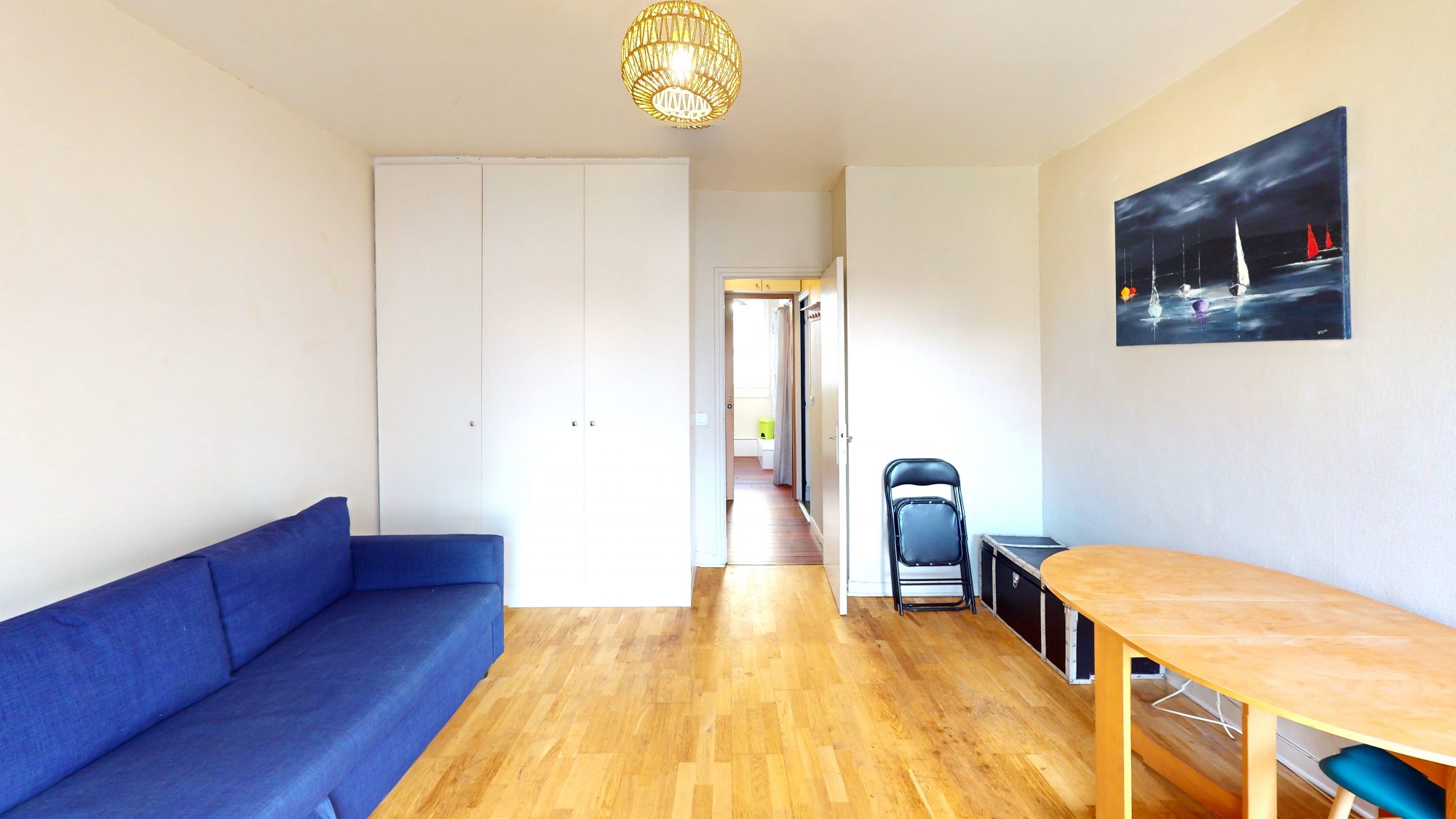 L’appartement vendu meublé, comprenant une entrée avec rangements, une pièce de vie de 16,5 m² avec grand placard et accès direct à une terrasse de 11 m², une cuisine aménagée et équipée, ainsi qu’une salle de douche avec WC.