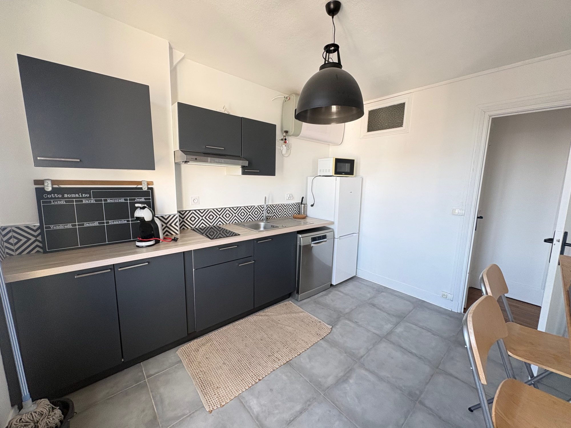 Il se compose comme suit : entrée, séjour, cuisine aménagée et équipée (plaques, hotte, réfrigérateur, micro-ondes), chambre, salle de douche, wc indépendant