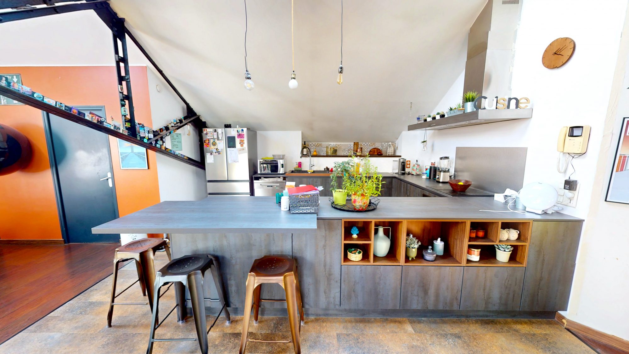 Étage : une large pièce de vie de 150m2 comprenant cuisine aménagée et équipée, un séjour, un salon, un bureau et un espace détente. Une terrasse est accessible depuis ce niveau.