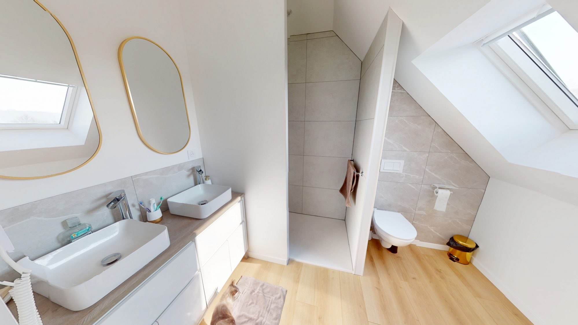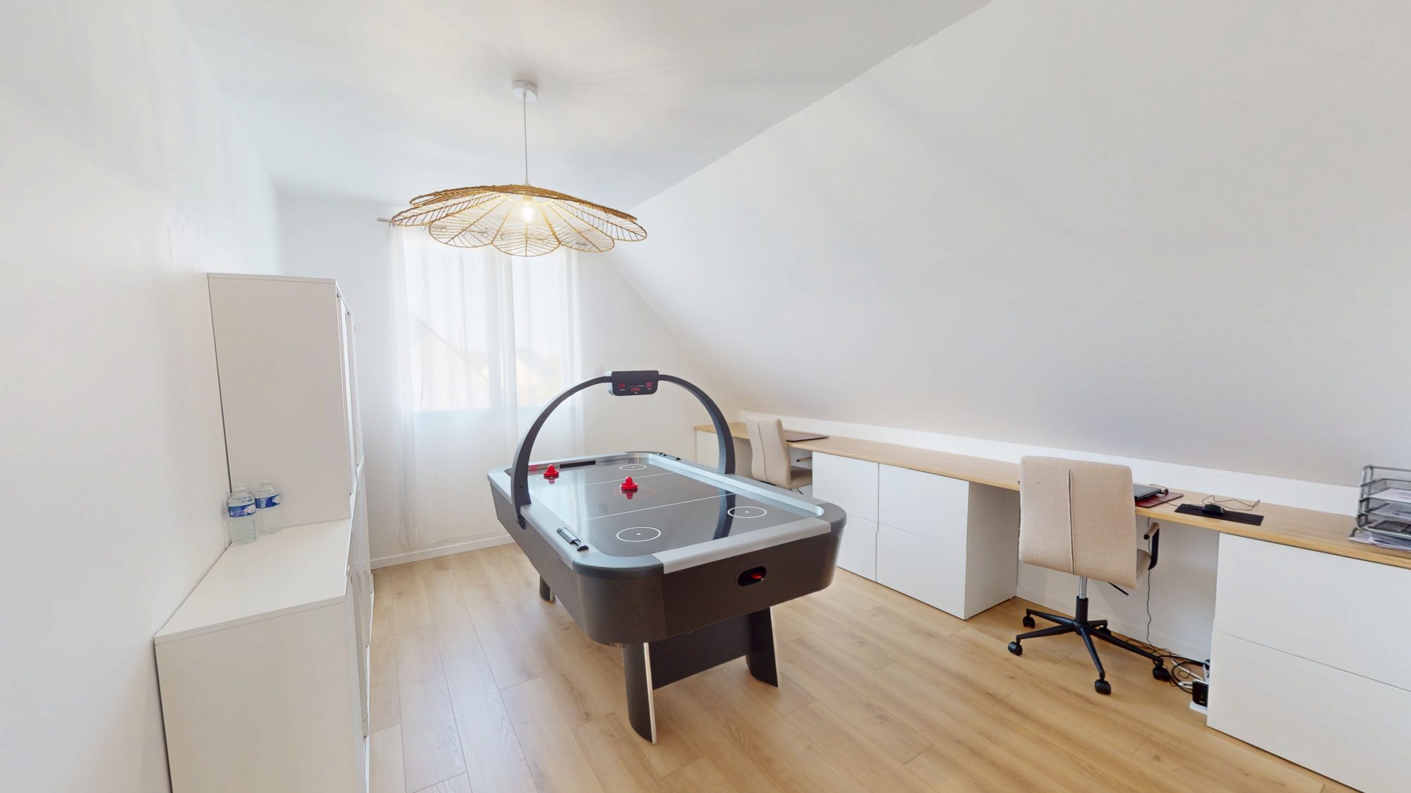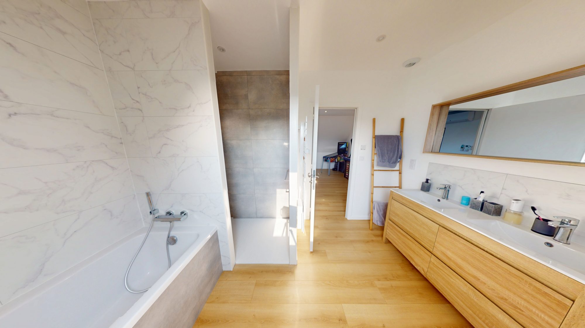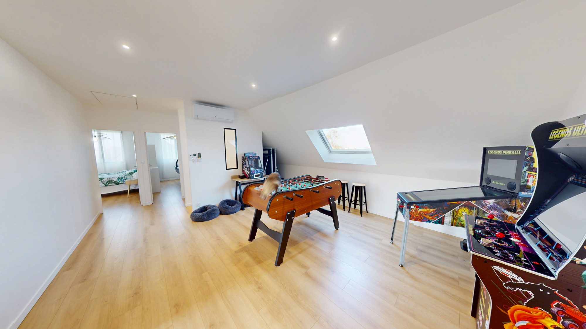 -1er étage : très grand palier de 25m2 servant actuellement de salle de jeux, desservant quatre chambres (16m2 les quatre) dont une avec sa salle d’eau et son W.C, une salle de douche avec baignoire et un W.C. indépendant.