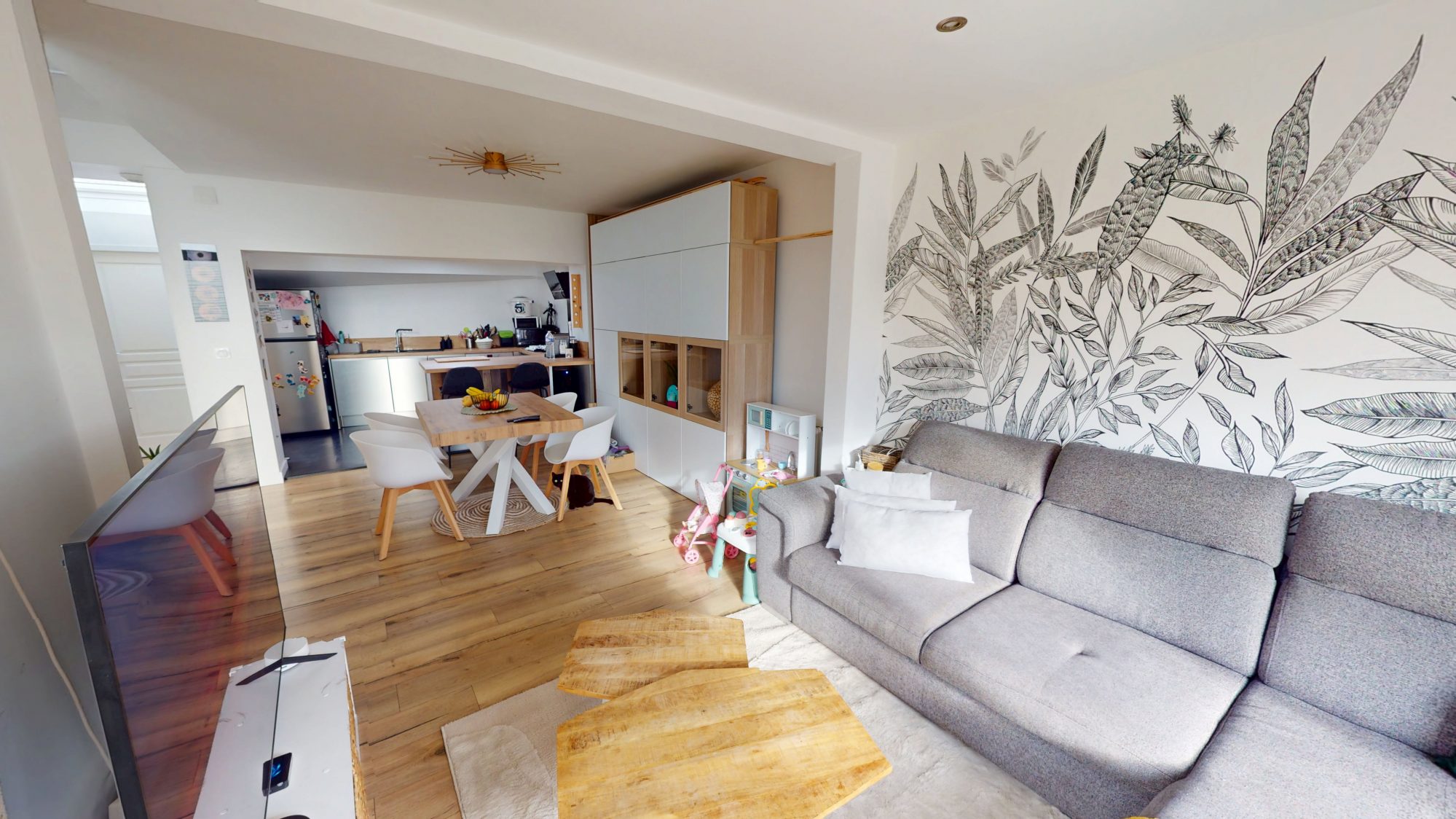 Une entrée, un grand salon-séjour de 23m2, une cuisine aménagée et équipée de 11m2, un coin bureau, un W.C avec buanderie, une salle d’eau et 2 chambres.