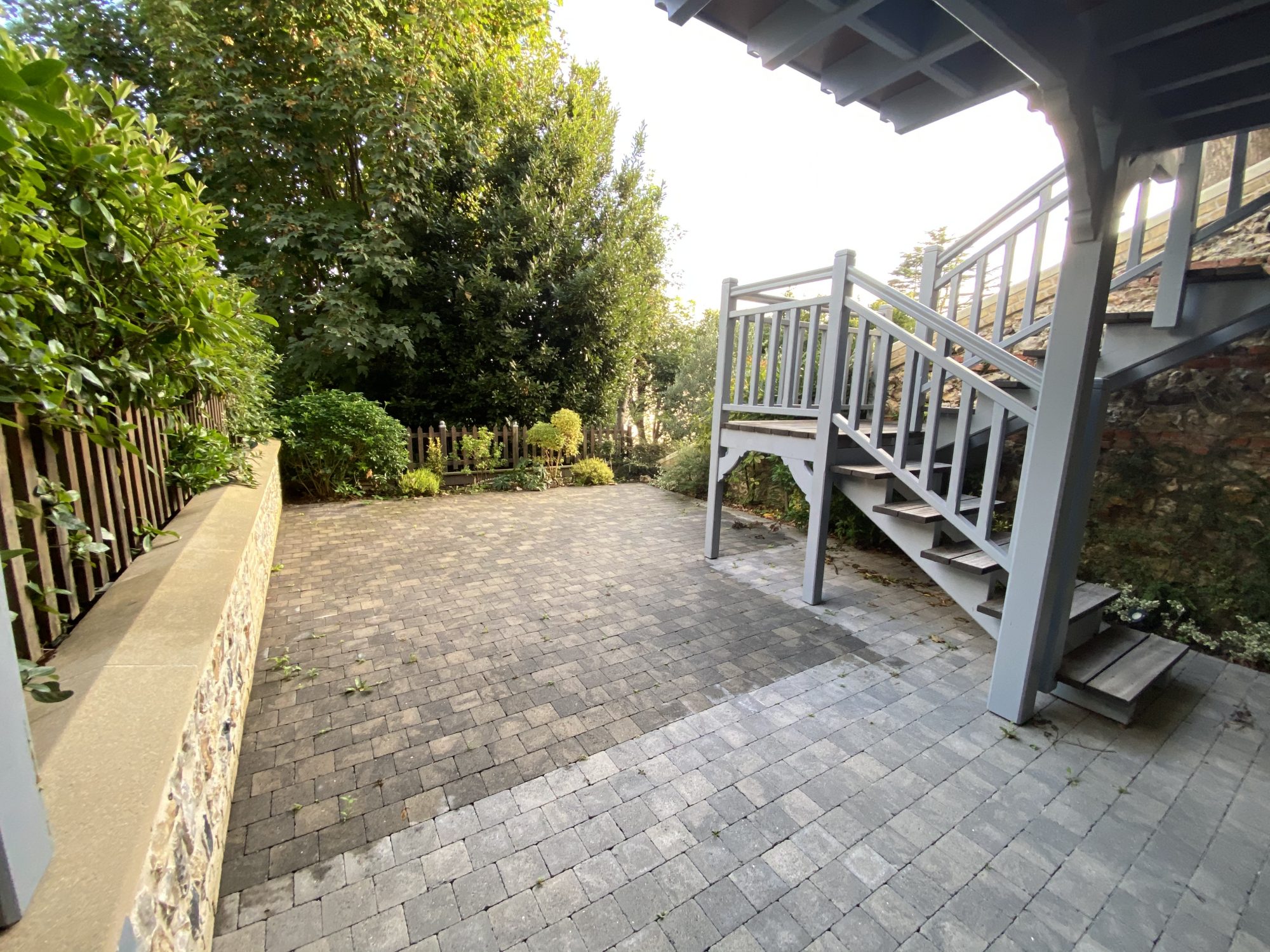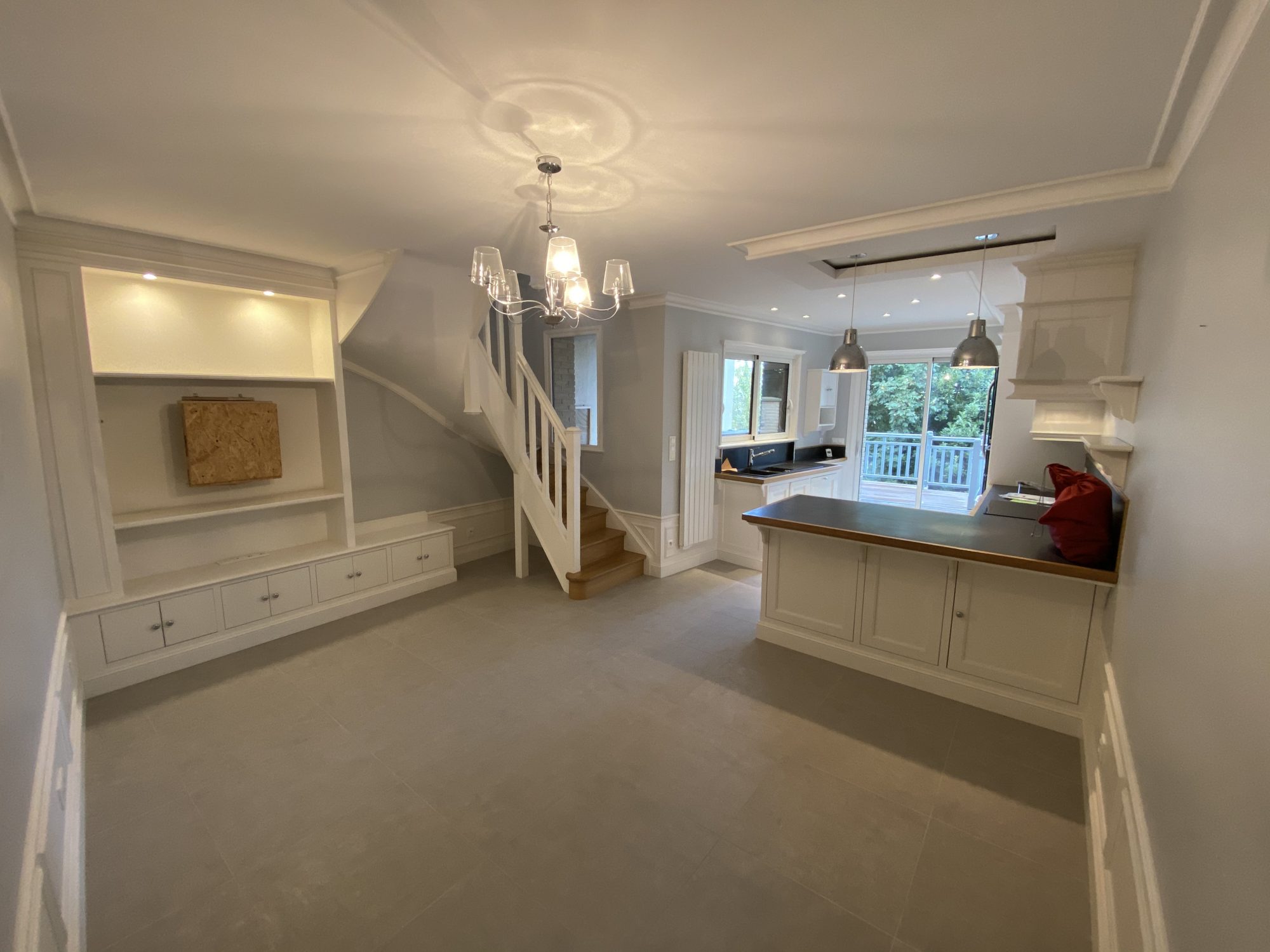 En bas, une cuisine d’été peut aussi servir de salle de sport, espace bien-être ou dépendance. Elle donne sur une terrasse pavée de 30 m² à l’abri des regards.